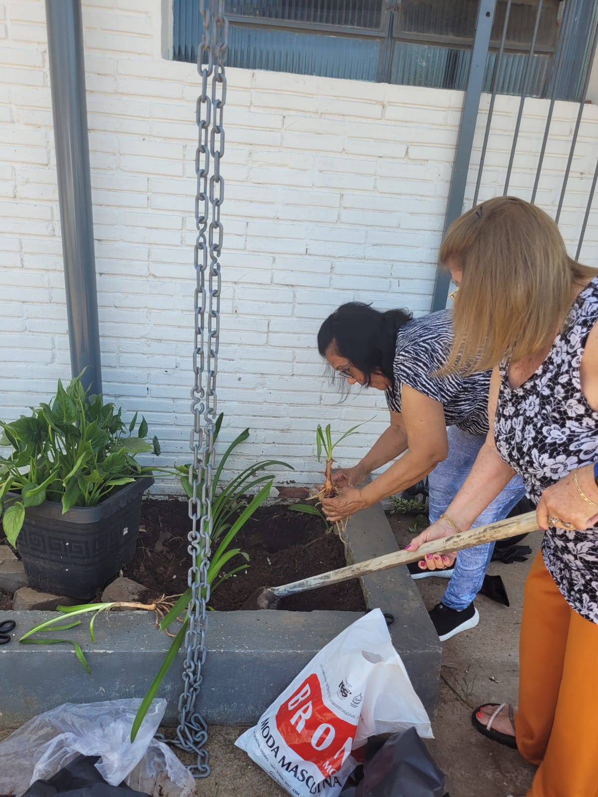 Na Oficina de Pequenos Reparos Domésticos da Ong Iluminar do dia 15.10 sendo já o décimo quinto encontro, as alunas sujaram as mãos na terra, lona e britinhas rosa para embelezar ainda mais o canteiro frontal da entidade.